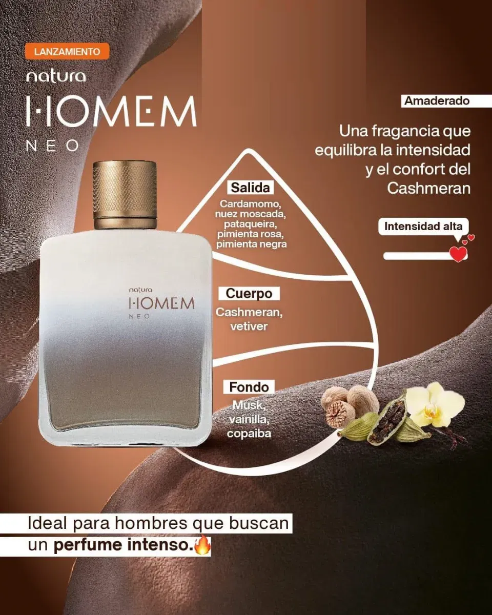 Homem Neo de Natura es una fragancia de la familia olfativa Amaderada para Hombres. Esta fragrancia es nueva. Homem Neo se lanzó en 2022. Homem Neo fue creada por Verônica Kato, Antoine Maisondieu y Christophe Raynaud. Las Notas de Salida son pimienta negra, pimienta rosa, cardamomo, nuez moscada, Pataqueira, toronja (pomelo) y bergamota; las Notas de Corazón son cachemira, bálsamo de copaiba, madera de gaiac, cedro del Atlas y vetiver; las Notas de Fondo son almizcle, ámbar, haba tonka, cumarina, vainilla y musgo.